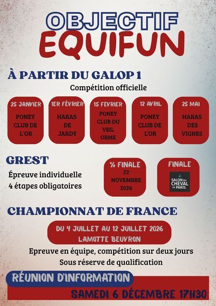 Discipline proposée : Equifun, CSO, Hunter, Derby, Dressage